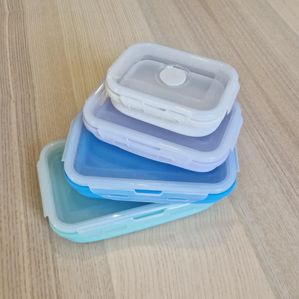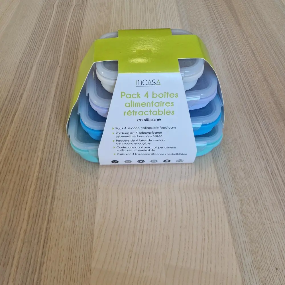 Lot de 4 boîtes alimentaires rétractables INCASA – Gagnez de la place dans votre van avec ces boîtes en silicone souple, légères et résistantes. 4 tailles différentes, empilables et rabattables, parfaites pour stocker vos repas et encas sans encombrer vos placards.